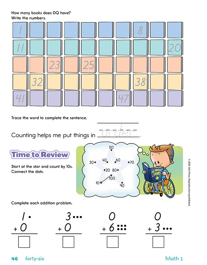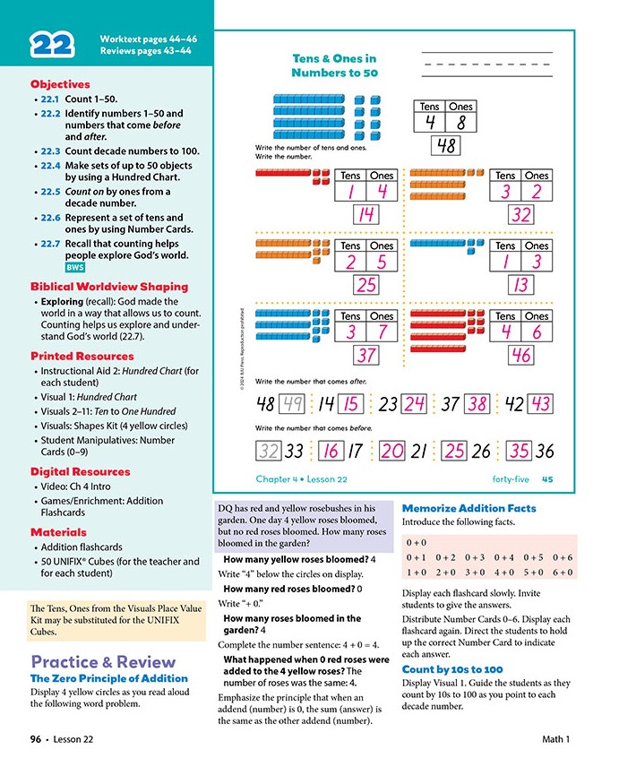 Math 1 empowers you to carefully lead your child through lesson content. As the teacher, you will deliver content through direct instruction as well as through modeling, demonstrations, and visual analysis. You can also lead discussions using manipulatives, object lessons, and colorful pictures.