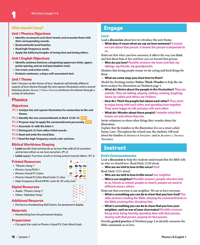 Phonics & English 1 endeavors to cultivate foundational phonics and English skills in your child so he or she can become a proficient reader and communicate in helpful ways. Your child will develop a foundational knowledge of English grammar and mechanics as well as collaborative, listening, and speaking skills. Your child will also learn to apply biblical worldview themes such as loving God and others, helpfulness, perseverance, joy, and creativity. The Phonics & English 1 Kit contains all the necessary materials for teaching Phonics & English 1.
