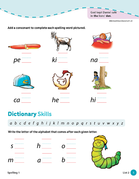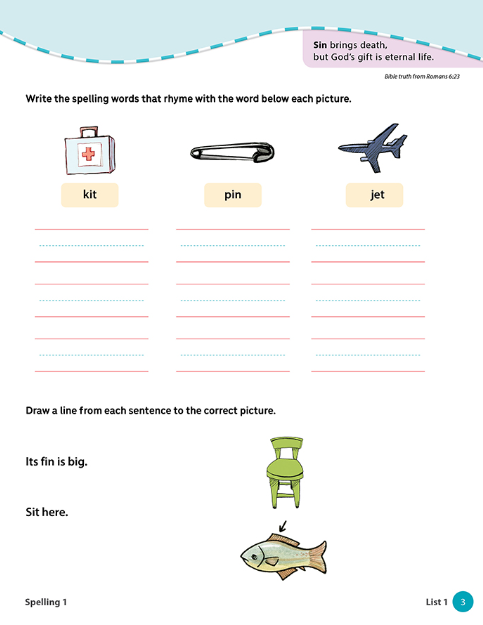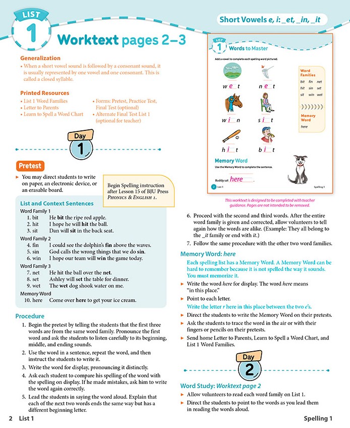 Spelling 1, 4th Edition from BJU Press, serves to help your child develop foundational spelling skills and recognize spelling as a tool to honor God and to love and serve others through writing. This course endeavors to strengthen the knowledge of God, advocate that God created and uses written language, and apply spelling skills to produce accurate, God-honoring written communication. The Spelling 1 Subject Kit contains all the necessary materials for teaching Spelling 1.
