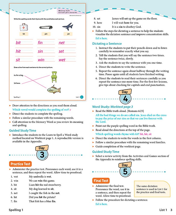 Frequent assessments enable your child to evaluate his or her abilities and practice recalling words. These assessments also build confidence and encourage mastery for producing God-honoring written communication. The first day of the week begins with a pretest on that week’s spelling words. The third day features a similar practice test, and the final day determines whether he or she has mastered the words for that week.