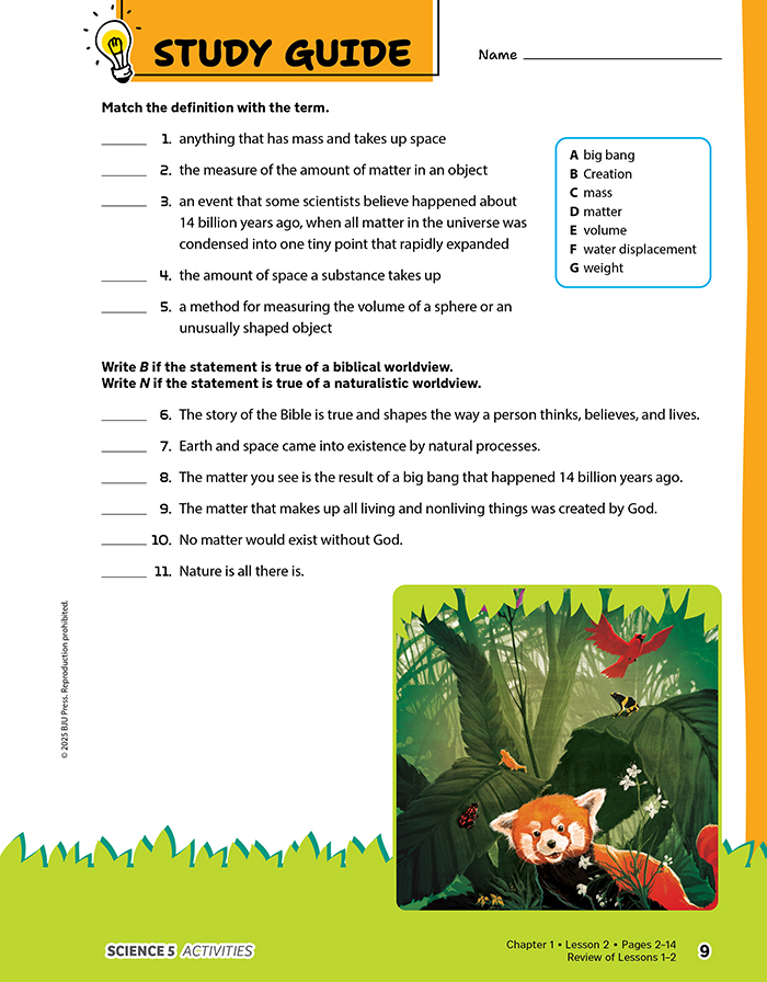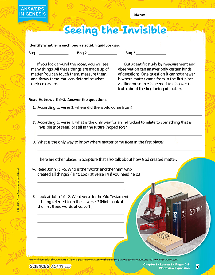 Science 5, 5th Edition develops a foundational understanding of physical science, life science, and earth science through direct instruction, independent learning, peer teaching, group activities, and hands-on activities. Students will learn how interpret and apply scientific knowledge through a biblical worldview.