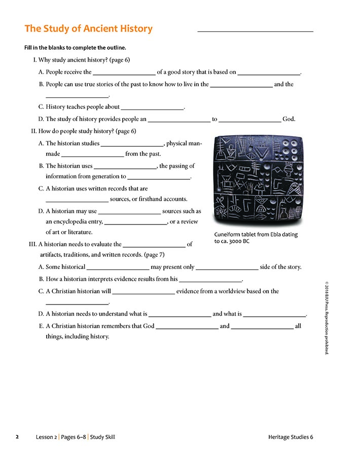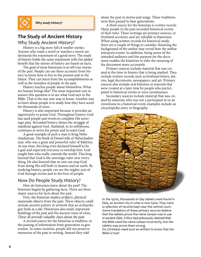 Heritage Studies 6 engages students to think like Christian historians with the awareness that the field of historians is an open pathway. This course covers the ancient civilizations of Africa, Asia, Europe, and the Americas. Special emphasis is given to how these civilizations influenced the world today. Students will focus on the theme of the Creation, Fall, Redemption, and they will learn to recognize it in ancient civilizations. The curriculum also strengthens critical-thinking skills through the use of: