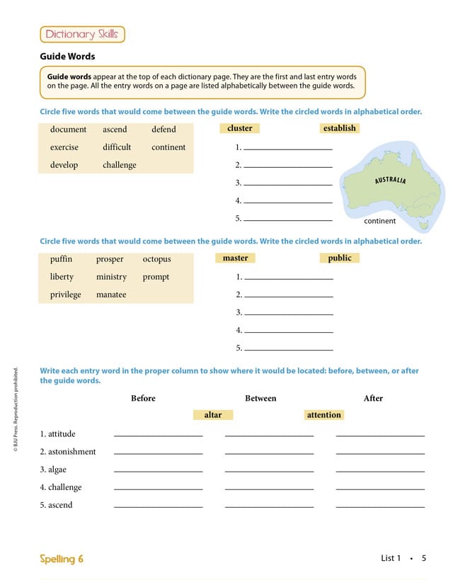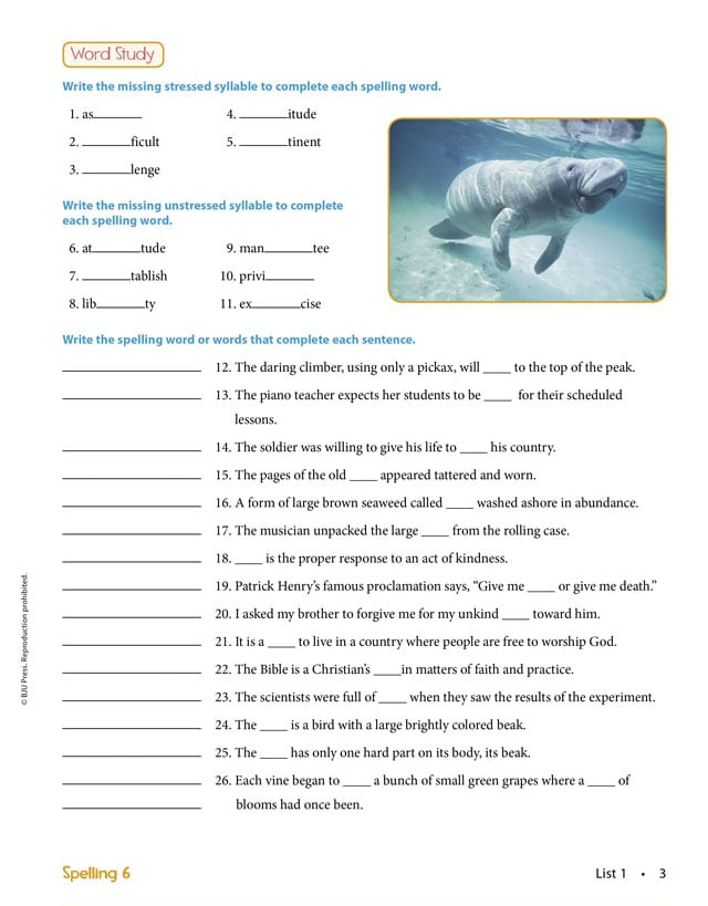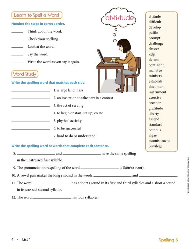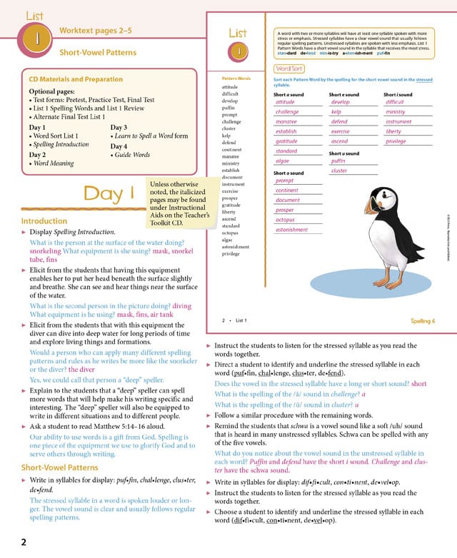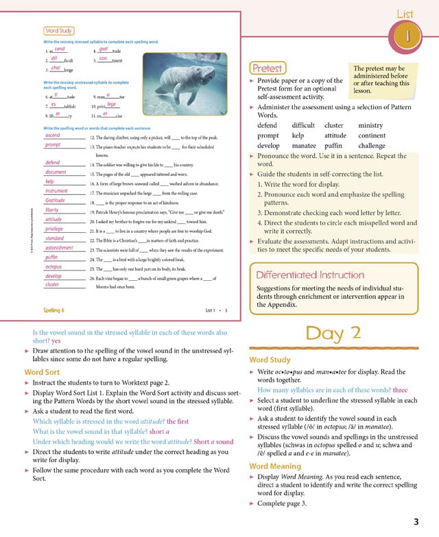 32 weekly spelling lists contain 25 words each. The Spelling 6 Teacher’s Edition includes interactive lessons about: