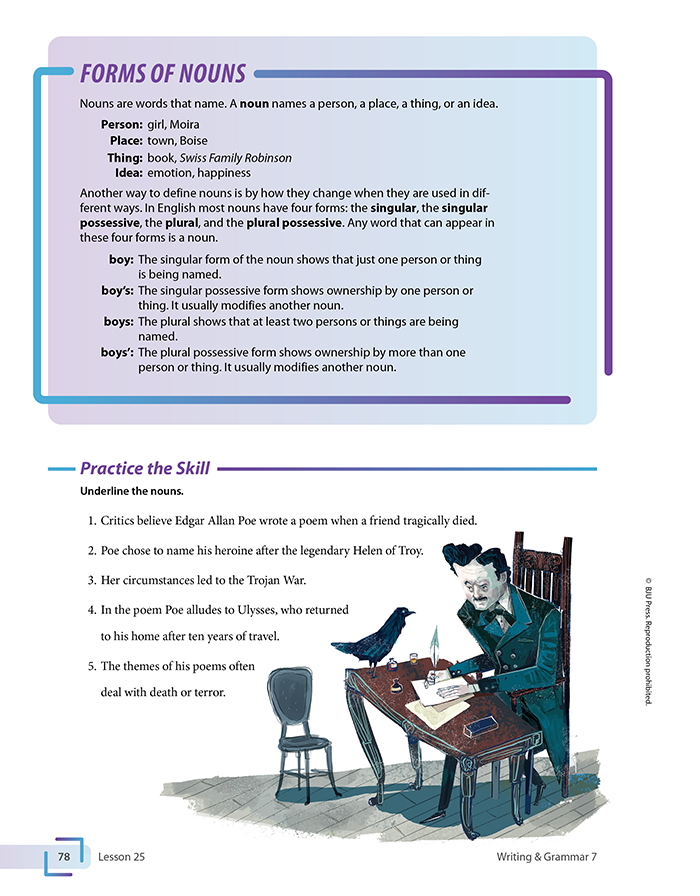 The common use of “txt-speak”, sound bites, and other shortcuts does not eliminate the need for your child to learn proper writing and grammar skills! Writing & Grammar 7 (4th Edition) from BJU Press presents clear instruction in writing and grammar, including an overview of the Writing Process and many focused writing activities. The seventh-grade English curriculum covers:
