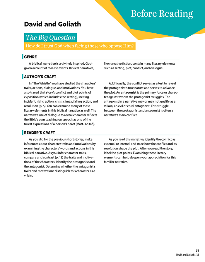 The student edition organizes its reading selections into five different themes. Literature selections from a variety of genres, authors, and time periods, help your students develop a cultural understanding of the themes. General activities and Big Questions will also provide natural opportunities for worldview shaping. Many selections feature engaging, exciting artwork for your students’ evaluation. Each selection will also guide students through the three stages of the reading process—preparing them to understand before they read, engaging with what they read, and helping them consider their worldview after they finish reading. This course can aid students in developing discernment about different and potentially dangerous philosophies.