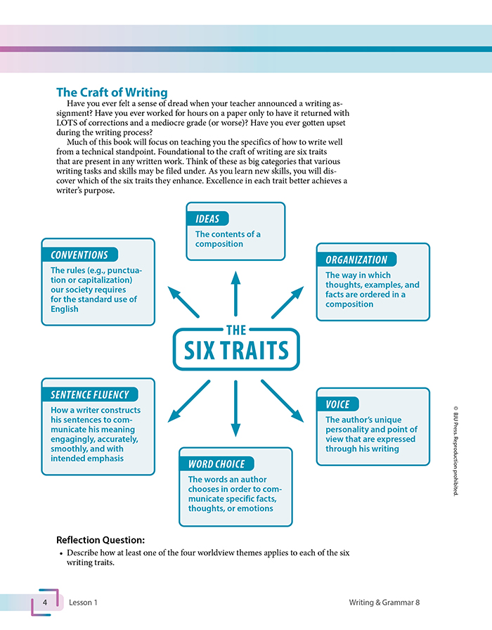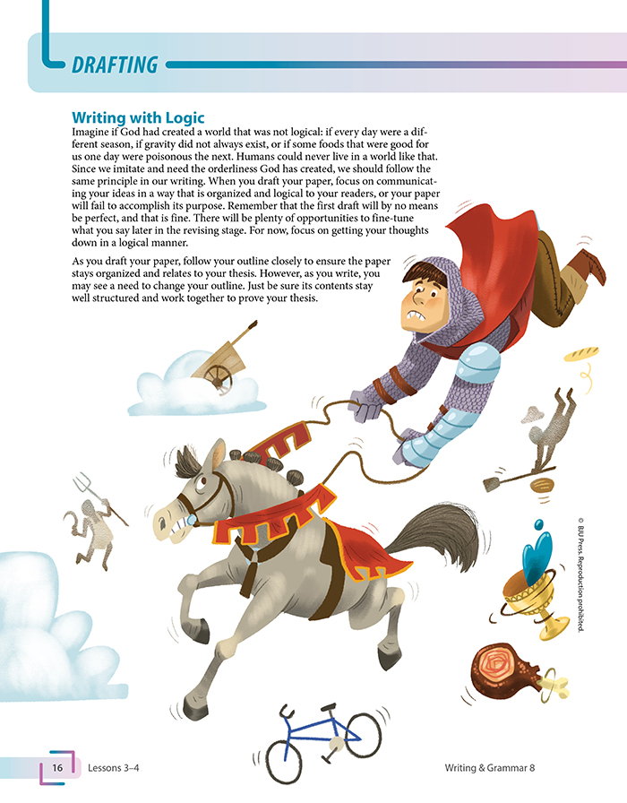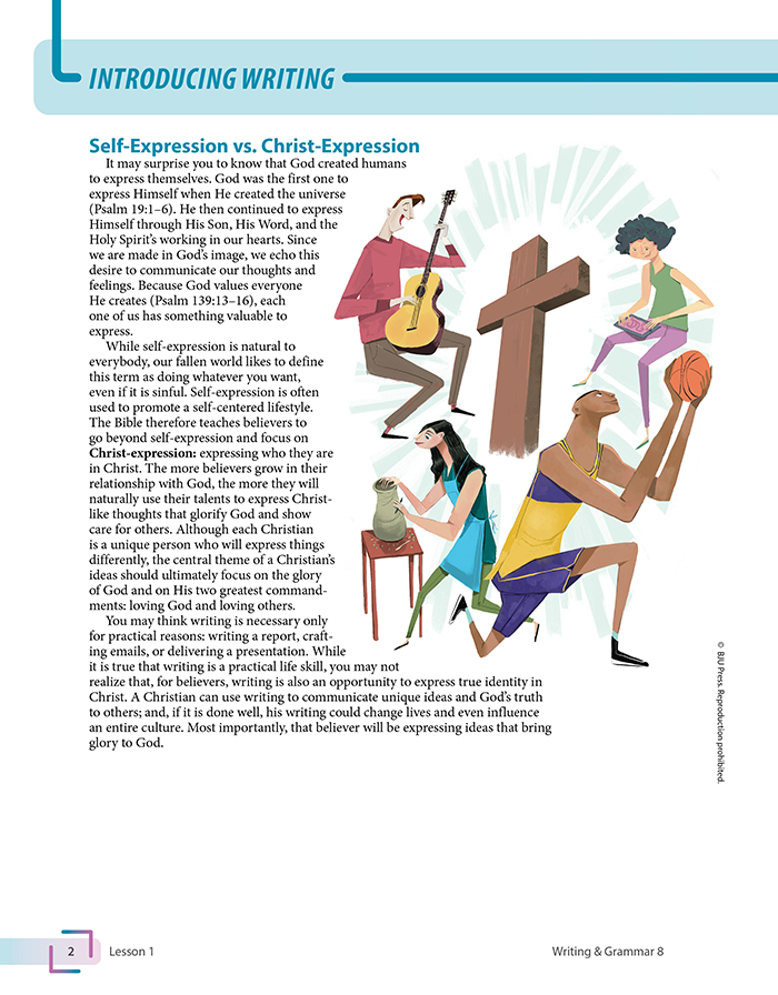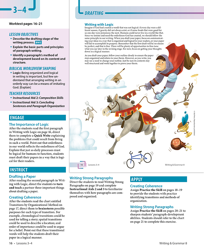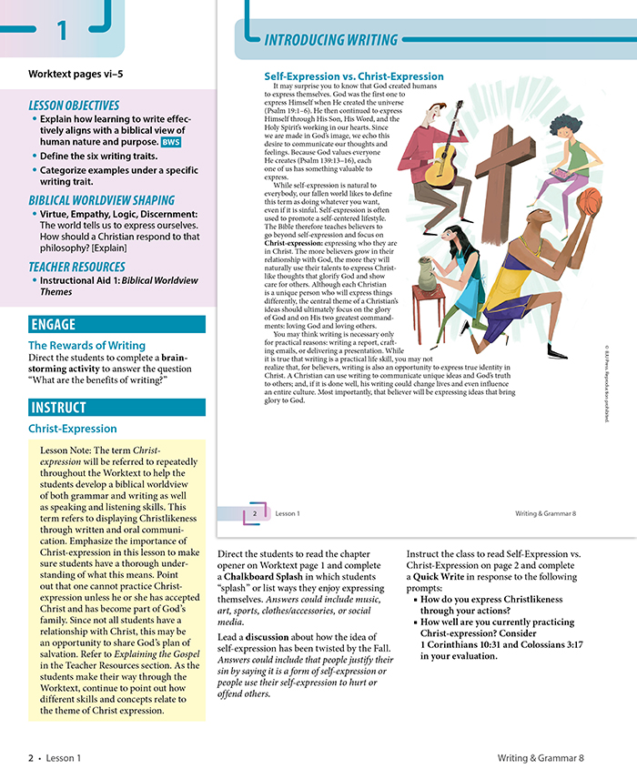 The 8th grade English curriculum builds on the foundations of grammatical understanding to prepare students for learning more complex grammatical structures and to use what they know in writing and speaking. Students will find mentor texts that provide models of excellent writing. Illustrations and photos also help foster student engagement when teaching difficult concepts. Most importantly, students will learn how effective communication aligns with a biblical worldview.