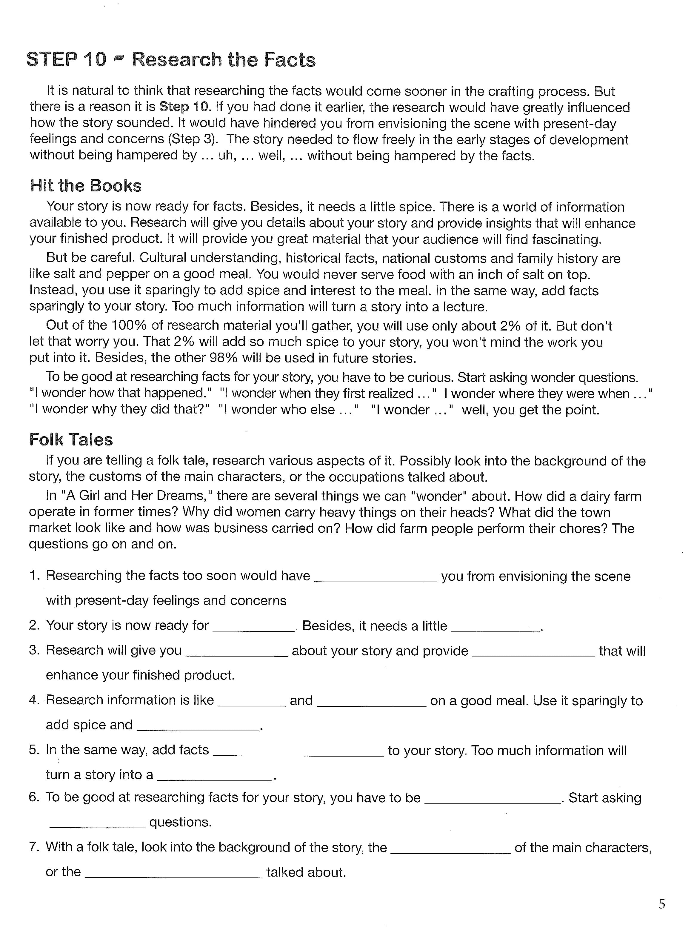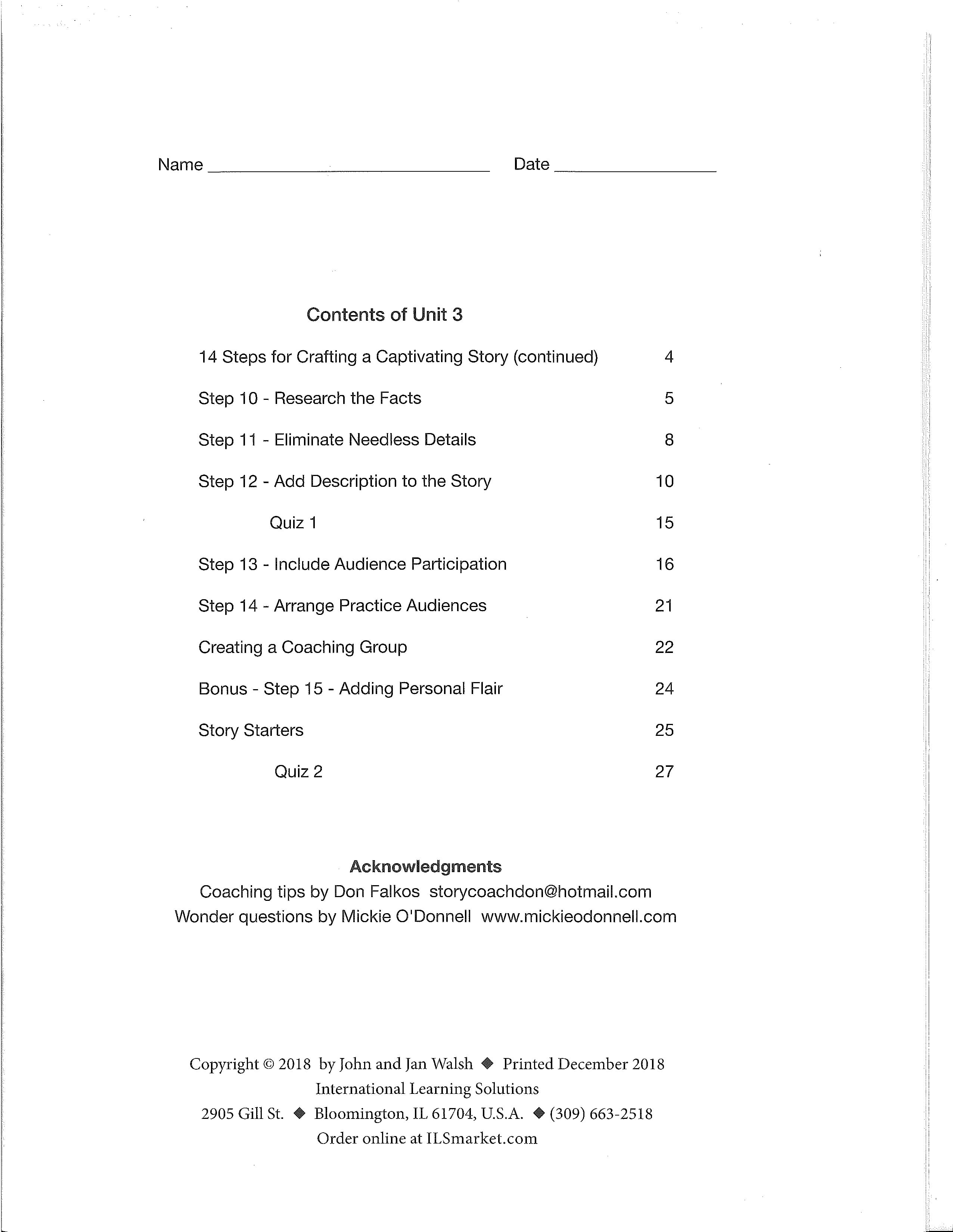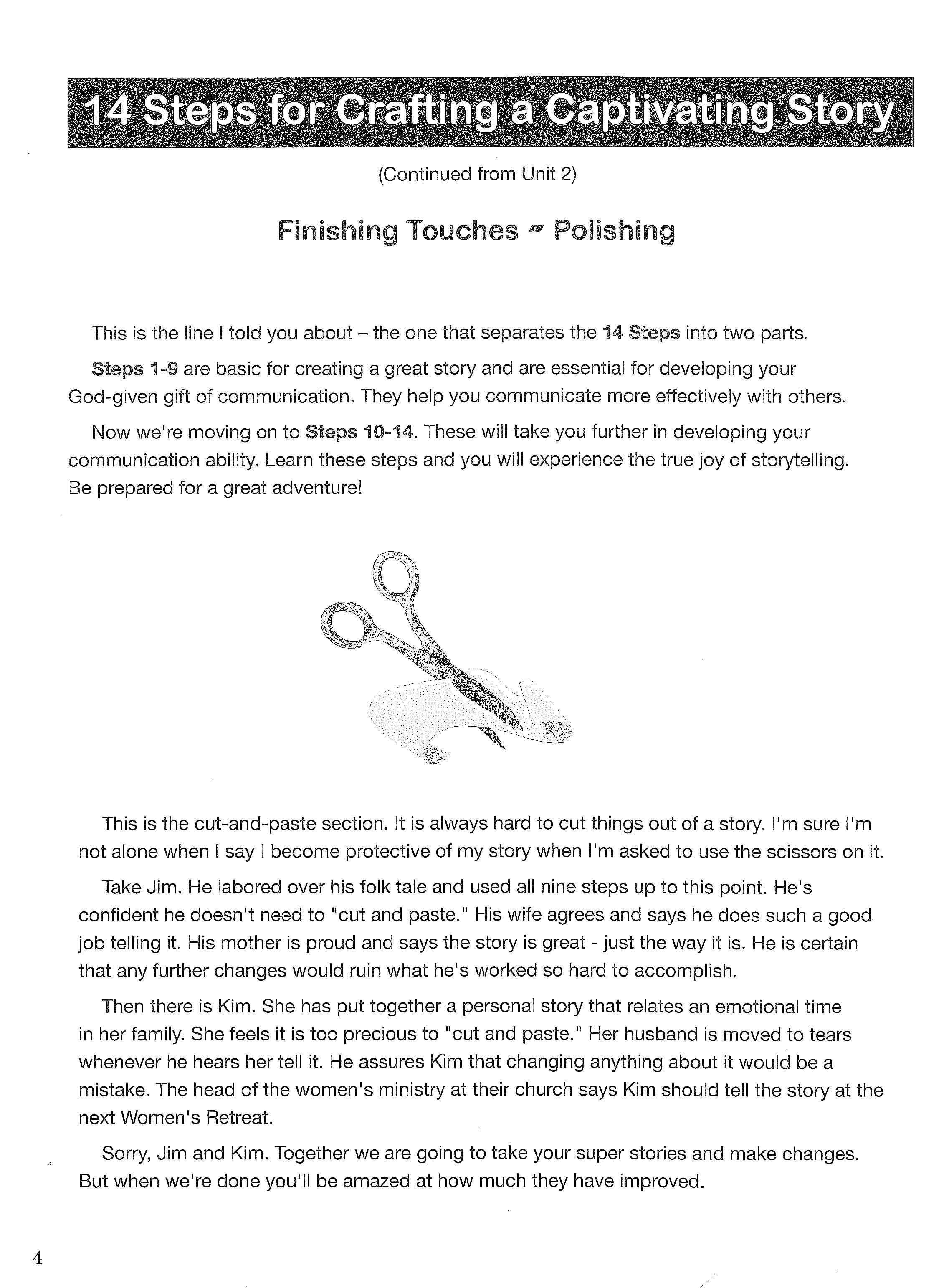 Creative Communication Skills Unit 3 presents steps 10 through 14 in preparing a story. These are (10) researching the facts, (11) eliminating needless details, (12) adding description, and (13) using audience participation. The last steps suggest how to find practice audiences and how to create a storytelling coaching group.