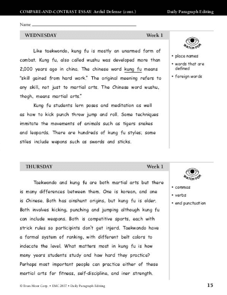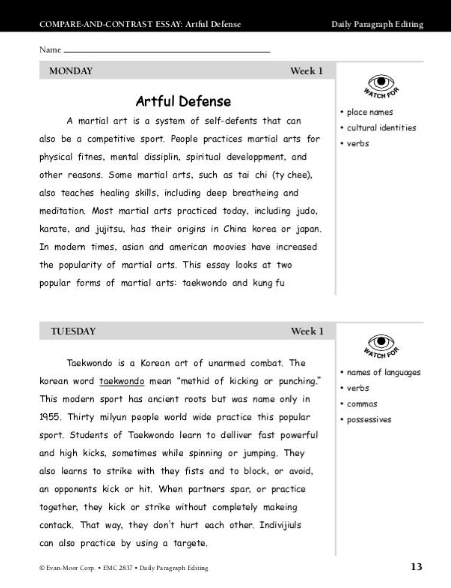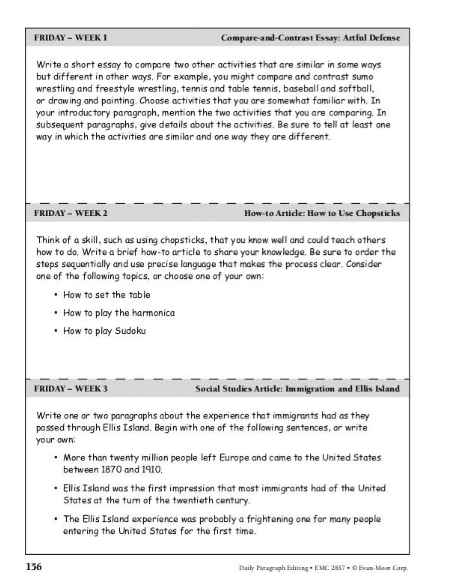 Daily Paragraph Editing Grade 7 provides practice to help your seventh graders learn the conventions of standard English grammar and usage. Students apply language skills to correct one paragraph a day, for four days. A writing prompt on Friday relates to the week’s four-paragraph composition and gives students the chance to apply the targeted language conventions. The weekly compositions cover a broad range of writing forms, including: