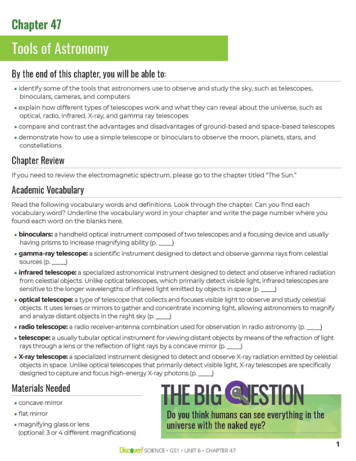 Discover! General Science 1 features essential vocabulary, writing tasks, and reading opportunities to help students build knowledge, reflect on learning, and apply concepts in both academic and real-world settings. The student worktexts offer activities, clear instruction, and extensions designed to engage all learning styles.