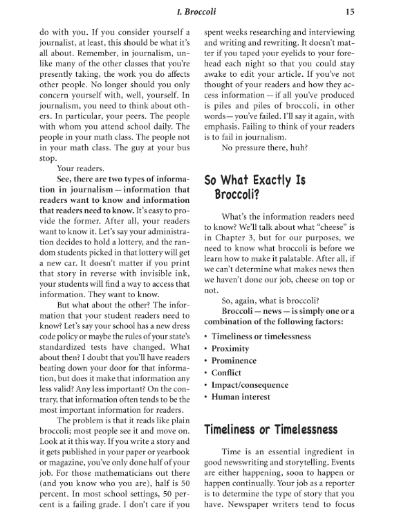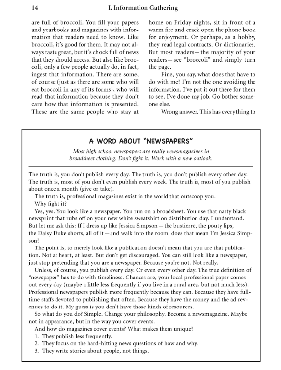 This handbook for high school journalists and teachers offers practical tips for all elements of school journalism. The author covers the essential components that students must understand: information gathering, writing, standard and alternative coverage and packaging. Students will find valuable information about identifying news, interviewing, research, narrative writing style, editing, visual presentation and layout. The book also covers the legal rights of student journalists, objective vs. opinion writing, staff planning and organization and Web-based journalism. Each chapter includes study guides for practical applications of the concepts discussed.