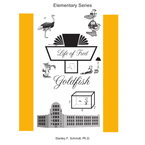Here is the fine print Life of Fred: Goldfish contains Tulip Mania, Drawing Things to Scale, Digits in a Number, Similes, Being Pardoned Before Being Tried in 1974, What Is Rarely on a Doll’s Christmas List, the Whole Point of Math, Don’t Wave Your Money Around, the Advanced Form of the Game of Which of These Is Not Like the Others, Keeping Your Word, Picking Your Friends and Your Spouse, Polygons, Sequences, a Crocodile Smile, What to Remember If You Smoke, Comparative Forms of Adjectives, Superlative Forms of Adjectives, a Waning Moon, People’s Life Goals Are Different than Fish’s Life Goals, Definition of an Acre, What Gets Venerated, Meters vs. Yards, Four Countries That Are Nations of Immigrants, Kilograms vs. Pounds, How to Deal with a Duck Who Never Tells the Truth, Lacrimal Glands, Area of a Rectangle, Living in a City vs. Living in the Country, Volume of a Fish Tank, Cubic Feet into Gallons, Gallons of Water into Pounds, Multiplying by Ten, Hundred, and Thousand, One Ton = 2000 lbs., Anthropomorphizing Fish, Plastic Aquarium Plants Don’t Die, Decimal Point, Estimating Sums, Drawbacks to 180-gallon Fish Tanks, Physical Work vs. Mental Work, Tragedy of the Commons, a Fish in a Tank vs. Coalback in Jail, Talking to Your Goldfish, Kingie’s Favorite Composers, Practicing the Metric System with Dental Floss, Purchasing Foreign Products, Bar Graphs, Protein and Calcium for Growth.