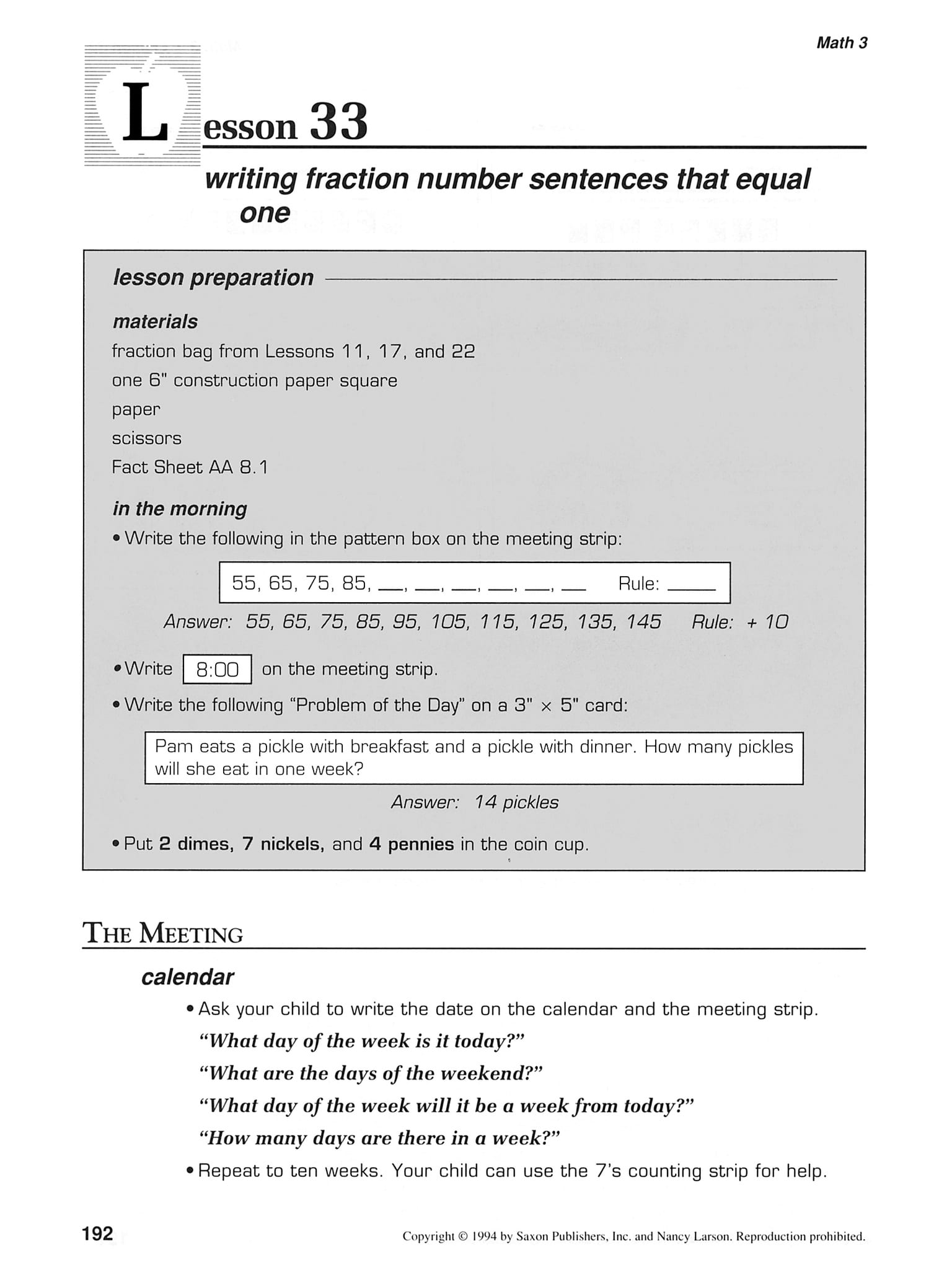 This curriculum is written so that the parent can teach the lessons to their students with ease. Each lesson provides ample opportunities for practice. I like how each lesson begins with “The Meeting” where you review skills such as calendar, money, temperature, patterns, problem of the day…this daily review is a great way to help students recall information previously learned. This curriculum covers numbers and operations, geometry, problem solving, measurement, and data analysis.