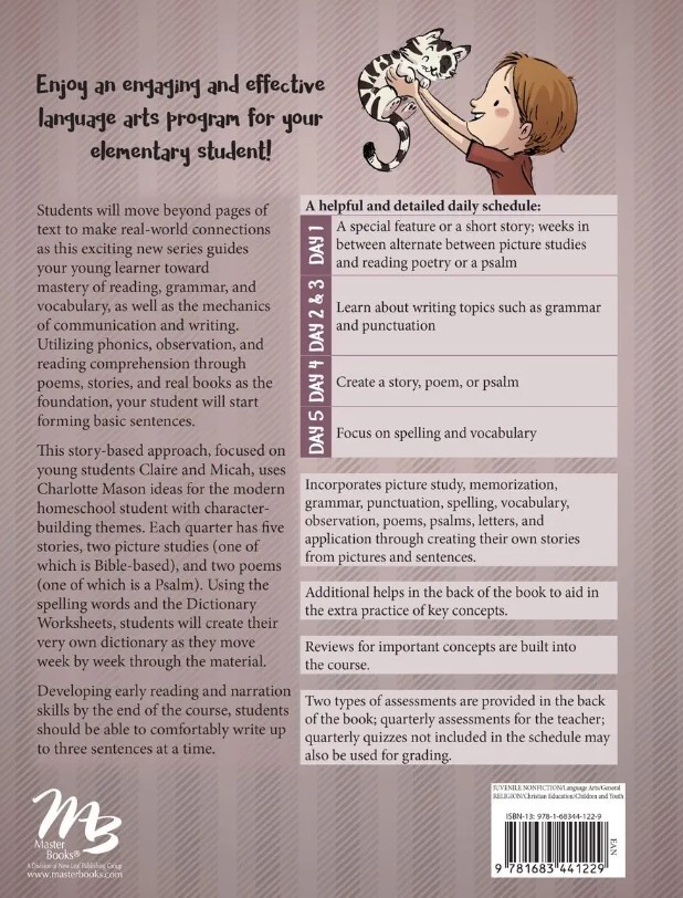 Homeschool families love that Language Lessons for a Living Education Level 2 continues the fun and engaging story of Claire and Micah. Using the Master Books method of education, author Kristen Pratt incorporates poems and picture studies, as well as faith-growing verses to reinforce what students are learning. Educational activities and assignments also include memorization, grammar, punctuation, spelling, vocabulary, observation, psalms, and letters. Students learn to apply their new skills by creating their own stories from pictures and sentences.