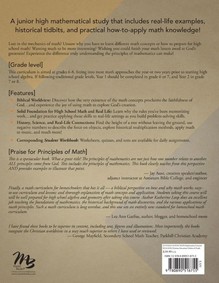 Principles of Mathematics Book 1 goes beyond adding a Bible verse or story to math instruction, it actively teaches and describes how the consistencies and creativity we see in mathematical concepts proclaim the faithful consistency of God Himself and points students towards understanding math through a Biblical worldview.