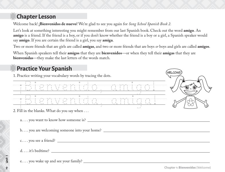 • Song School Spanish Book 2 (consumable student edition) This book contains 31 weekly chapters, including review chapters, and comes with audio files that have more than 25 songs/chants* (sung by native Spanish speakers) featuring the vocabulary from each chapter—a delightful part of the program that reinforces the Spanish taught in the book. Each weekly lesson is peppered with songs, illustrations, handwriting practice, and activities for easy mastery and memorization. These activities include matching, writing, fill-in-the-blank, and drawing. Students will learn 185 everyday Spanish vocabulary words and phrases for people, places, things, actions, feelings, questions, days of the week, months of the year, the weather, and more. *Please note: on the inside back cover, there is information on how to access the streamable audio files, that replace the audio CD.