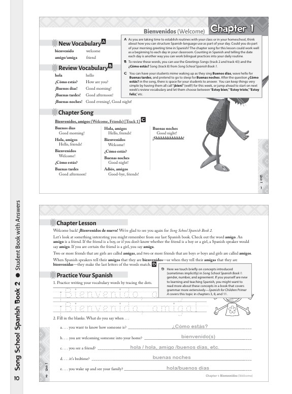 • Song School Spanish Book 2 Teacher’s Edition This edition contains the full content of the Song School Spanish Book 2 student text, along with answers and teacher’s notes and tips. This teacher resource also incorporates brand-new small group activities, designed to help students practice vocabulary and get used to speaking Spanish for a real task, and active games, designed as opportunities to combine language acquisition with gross motor movement. This teacher’s edition is a valuable accompaniment to your student’s Spanish studies!