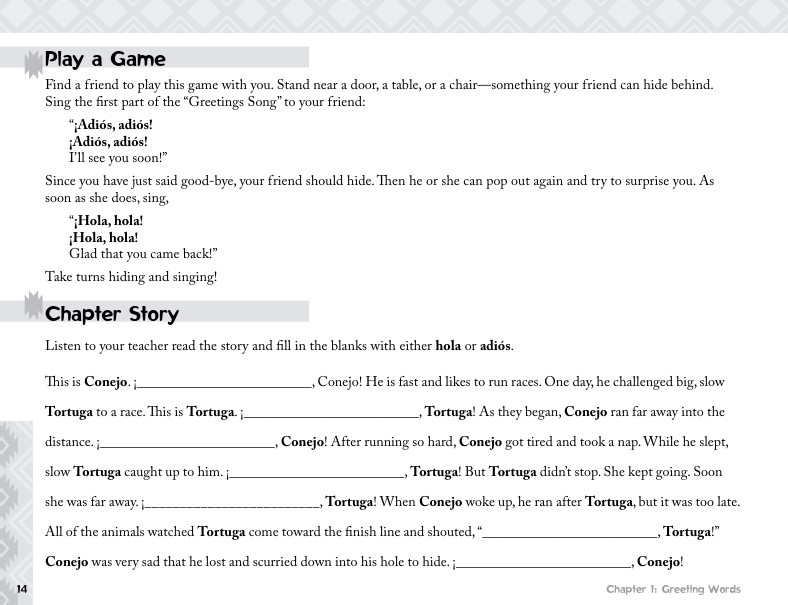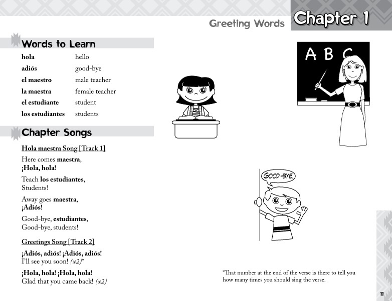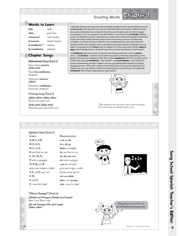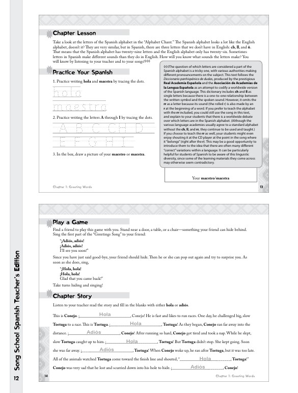 • Song School Spanish Book 1 Teacher’s Edition This edition contains the full content of the Song School Spanish Book 1 student text, and also provides an answer key, additional teacher’s notes, and fun ideas for interactive classroom activities. The latter portion of the book consists of extra activity pages and worksheets for each chapter, including the review chapters.